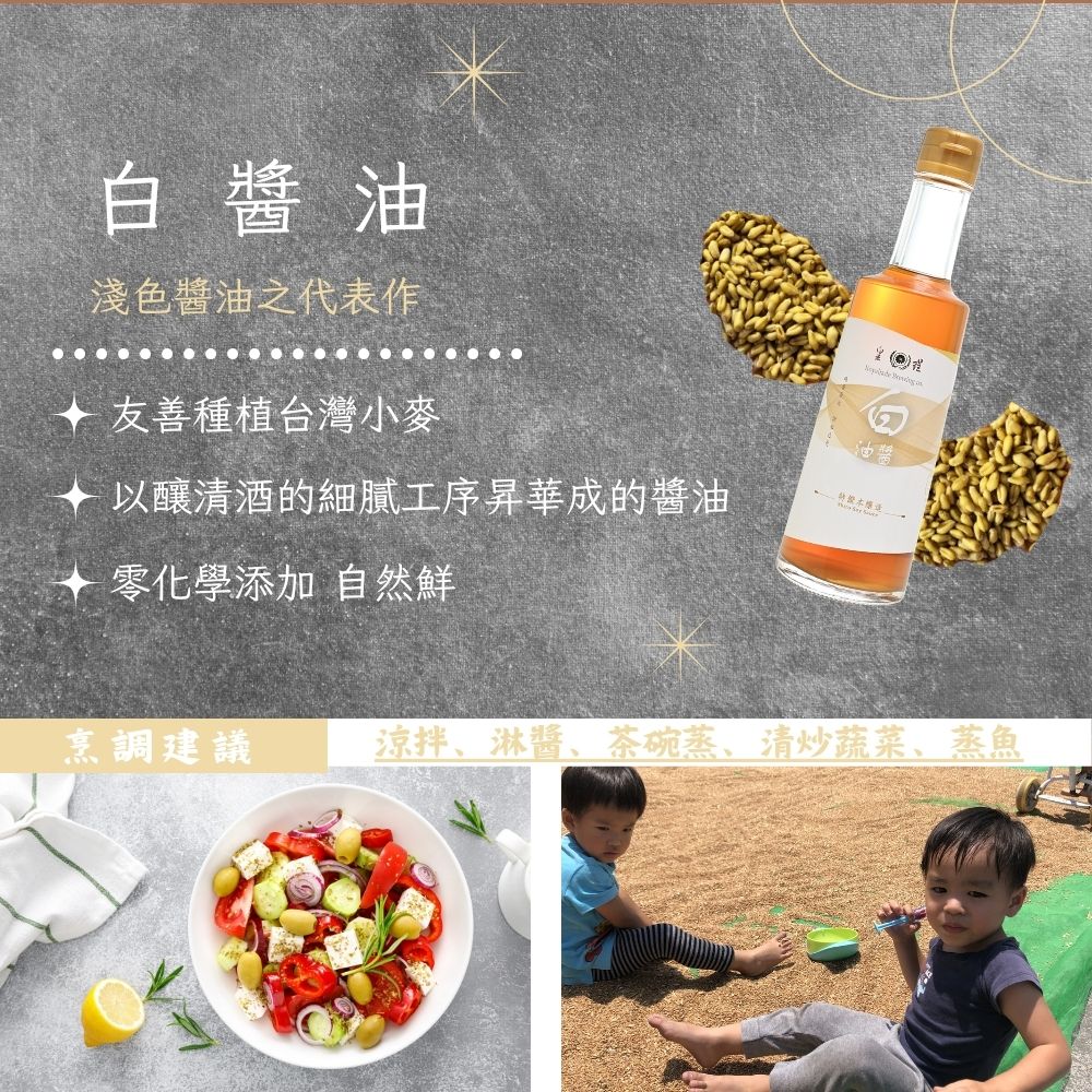 ***白醬油的色澤會隨著時間逐漸變深(純釀造醬油都有一樣的特性,只是本身顏色較深,變化感覺上不明顯)