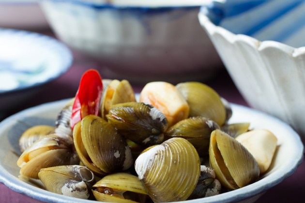 這次他提供四款醬油,分別以茶豆和小麥釀製的濃口醬油、以黃豆和岩鹽發酵一年的溜醬油、以黑豆和小麥釀製的黑豆醬油,還有釀製一年的原粹黑豆醬油,王師傅以此烹製了四道菜餚,分別是甘味鹽蜆、捆燒迦納魚、軟煎溜肉和椒鹽豬腳。